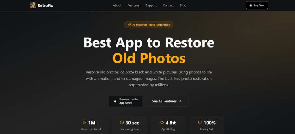 RetroFix is a free iPhone app that makes old photo restoration simple. With over a million downloads, it uses AI to do the heavy lifting. In about 30 seconds, you can repair damage, add color to black-and-white photos, or animate still images. No editing experience needed.