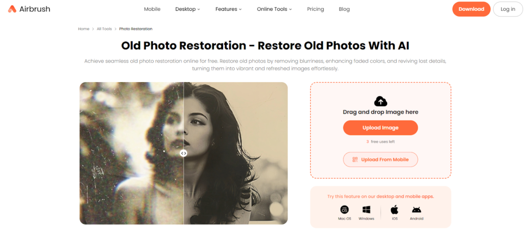 Airbrush is an AI-powered tool that restores old photos. You can use it online or on iOS and Android devices. Just drag and drop your photo and use the one-click restore button. It reduces noise, improves overall quality, and revives faded colors. You do not need any editing experience.